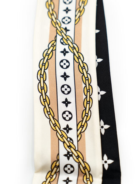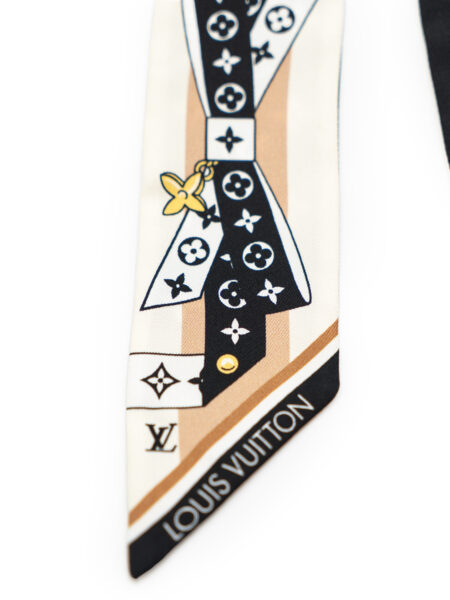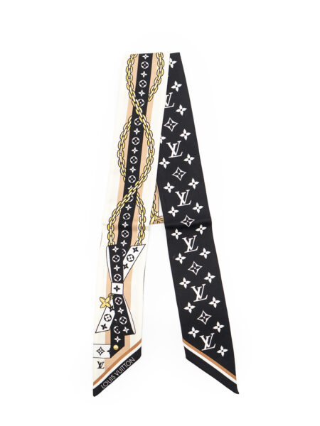 Il bandeau LV Bow BB, realizzato in seta, si distingue per la delicata fusione di eleganza femminile e stile contemporaneo. La stampa raffigura un nastro decorato da fiori Monogram, intrecciato a catenelle sottili e legato a formare un grazioso fiocco. L’accessorio, indossato al collo, al polso, o abbinato a una borsa, aggiunge un tocco raffinato a qualsiasi completo. Nuovo mai utilizzato, non presenta etichetta del lavaggio.